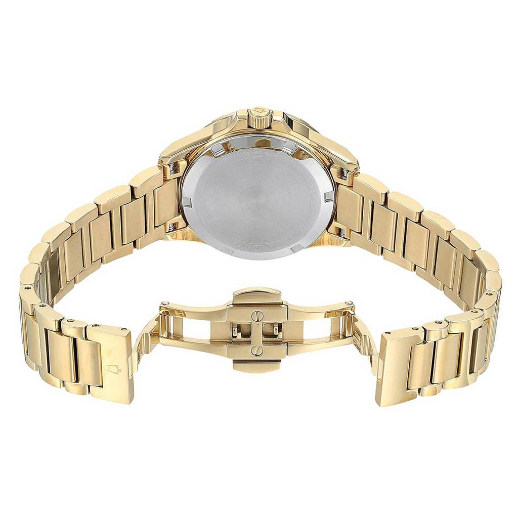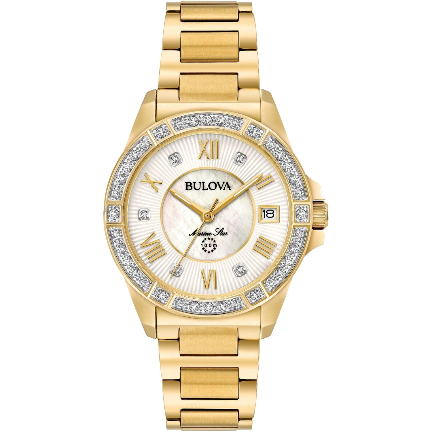 From the Marine Star Collection. New Marine Star in gold-tone stainless steel case with 29 diamonds individually hand set on gold-tone accented bezel and dial, white mother-of-pearl inner dial, sapphire glass, screw-back case, gold-tone stainless steel bracelet with double-press deployant closure, and water resistance to 100 meters.